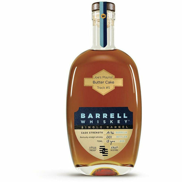Joe's Playlist Track #5 Butter Cake is an 18-year-old KY Single Barrel Whiskey that stands out like a buttery, biscuity nightly sipper. It was selected for its creamy, corn-forward nose that reminded Joe of comfort baking. There are only 172 bottles of Track #5 "Butter Cake".