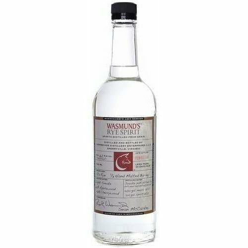 Wasmund's Rye Whiskey, bottled at barrel strength prior to aging. This clear spirit is hand crafted from 2/3 Virginia rye and 1/3 Thoroughbred barley developed and grown locally, exclusively for Copper Fox Distillery.